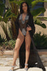 Complementing the swimsuit is the matching long sheer black duster cover-up, made from 100% Polyester. This elegant piece drapes beautifully over the swimsuit, enhancing your look with its flowing silhouette. Whether you’re attending a chic beachside event or a stylish resort gathering, this cover-up adds a layer of sophistication and allure.